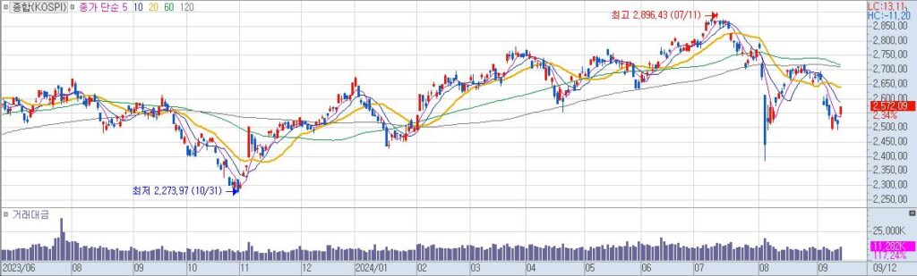 여러 종목 골고루 상승했지만 주도 섹터없이 순환하는 장세.